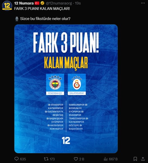 Kalan maçların paylaşıldığı görselde hem Fenerbahçe hem de Galatasaray’ın logosunda 5 yıldız kullandı. Yapılan bu paylaşım taraftarlardan reaksiyon aldı.