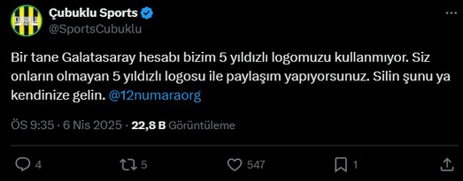 Fenerbahçe Resmi Taraftar Sitesi 12 Numara, toplumsal medya hesabından yaptığı paylaşımda Galatasaray logosunda 5 yıldız kullandı.