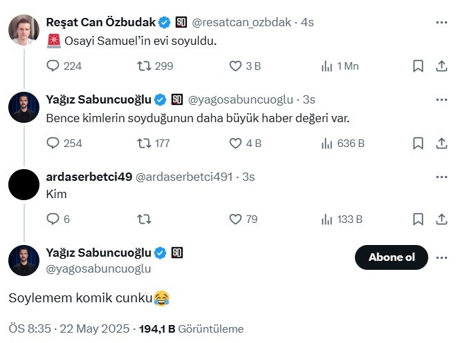 Bir kullanıcının soygunla ilgili gönderisine yorum yapan Sabuncuoğlu, “Bence kimlerin soyduğunun daha büyük haber kıymeti var” sözlerini kullandı. Takipçilerin ısrarlı soruları üzerine ise, “Söylemem komik çünkü” diyerek gizemli bir karşılık verdi.