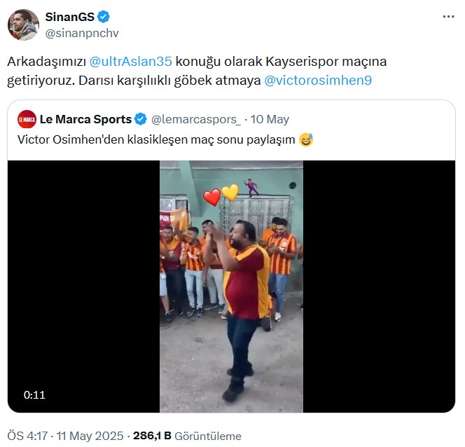 Bunun üzerine Galatasaraylı taraftarlar harekete geçti. Futbol yorumcusu Eray Can Gencer, “Video, İzmir Ballıkuyu’da bir ağabeyimize ilişkin. Ben bulup kutlamalara getirebilirim. Osi ile bir arada dans etseler ne yeterli olur…” diye paylaşım yaptı.