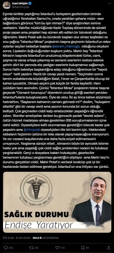 Senarist Gani Müjde, İBB soruşturmasında tutuklanan Uzman Polat için X toplumsal medya hesabından paylaşımda bulundu. Gani Müjde, Becerikli Polat için, “Üstün hizmet madalyası alması gerekirken İBB soruşturmalarının içine dahil edildi” sözlerini kullandı.