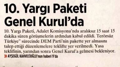 “10. Yargı Paketi Genel Kurul’da” başlığıyla birinci sayfada yer verildi.