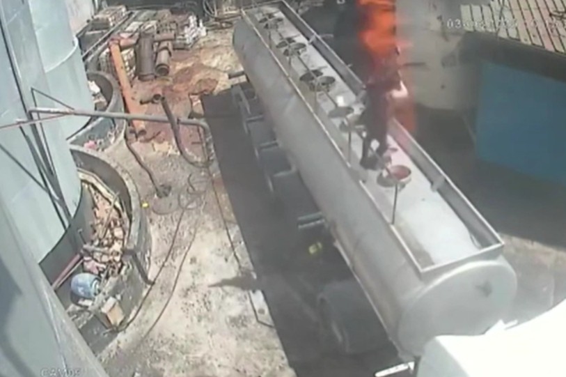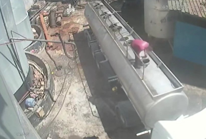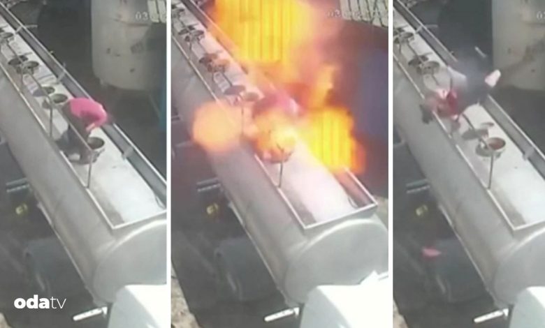 Tanker kapağının bomba üzere patlayıp, Bekir’in metrelerce yükseklikten düştüğü anlar, iş yerinin güvenlik kamerasına yansıdı.