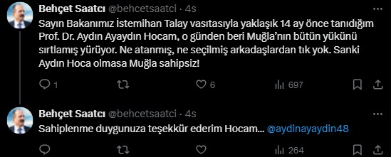 “Sayın Bakanımız İstemihan Talay vasıtasıyla yaklaşık 14 ay evvel tanıdığım Prof. Dr. Aydın Ayaydın Hocam, o günden beri Muğla’nın bütün yükünü sırtlamış yürüyor. Ne atanmış, ne seçilmiş arkadaşlardan tık yok. Güya Aydın Hoca olmasa Muğla sahipsiz!”