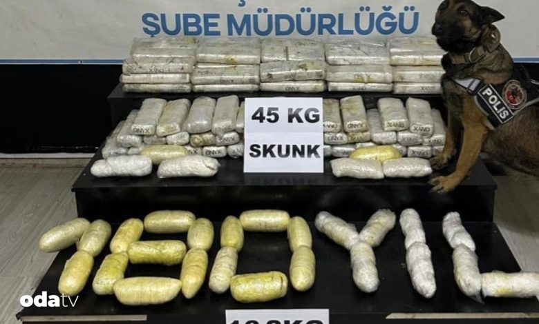 Narkotik dedektör köpekle yapılan aramada, tırın dorsesinde 5 torbada, 30 paket halinde 16 kilo 2 gram sentetik uyuşturucu ve 95 pakette 45 kilogram skunk ele geçirildi.