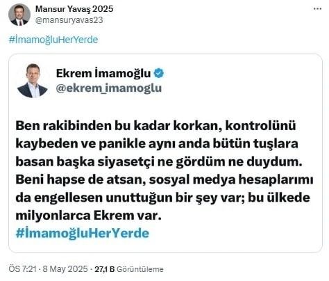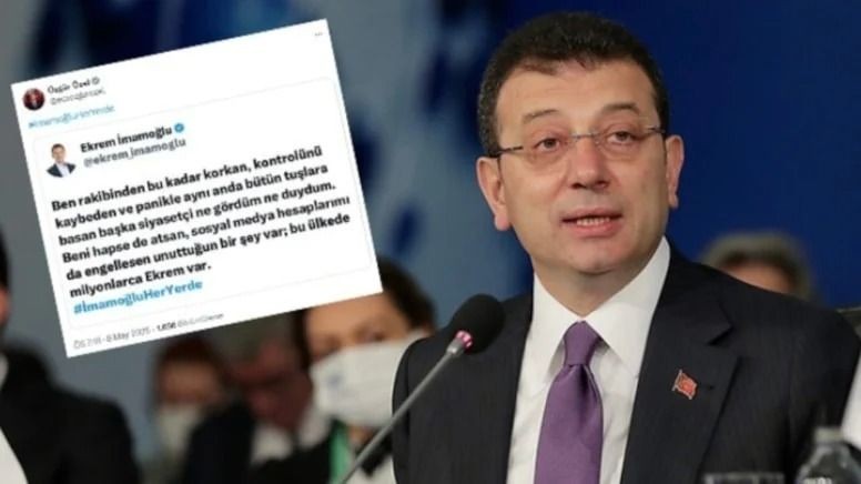 İmamoğlu paylaşımında ‘Ben rakibinden bu kadar korkan, denetimini kaybeden ve panikle tıpkı anda bütün tuşlara basan öbür siyasetçi ne gördüm ne duydum. Beni mahpusa de atsan, toplumsal medya hesaplarımı da engellesen unuttuğun bir şey var; bu ülkede milyonlarca Ekrem var’ sözünü kullandı.