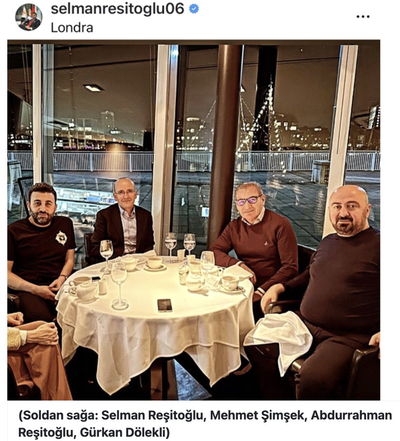 Selman Reşitoğlu, Londra’da akşam yemeğinde çekilmiş bir fotoğrafını paylaştı. Masada Hazine ve Maliye Bakanı Mehmet Şimşek, Selman Reşitoğlu, ‘yenidoğan çetesi’ davasında ismi geçen TRG Hospital’in ortaklarından Gürkan Dölekli vardı.