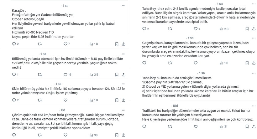 Bu paylaşımın akabinde bazıları, yerleşim yerine nazaran ani sürat limiti değişimleri olduğunu söyleyerek Karagöz’e takviye verirken, bazıları bu yolun otoban olmadığını ve 110 kilometre sürat hududu olduğunu belirterek eleştirdi.