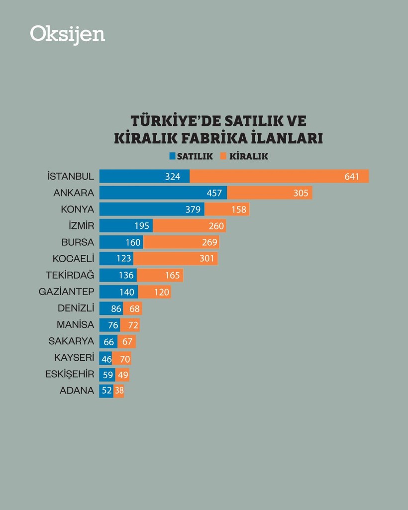 Sadece bir ilan sitesinde 2780 satılık. 2817 kiralık fabrika ilanı var. Türkiye’de şirketler esasen uçurumun kenarında dans ederek faaliyet gösterirdi, şu anda ise özellikle Anadolu yangın yeri. Bu ay içinde listelenen ilanlara bakınca, Türkiye’nin bütün lokomotif kentlerinin alev aldığı görülüyor. Özellikle Anadolu yanıyor. Konya ve Ankara, satılık fabrikalarda İstanbul’un bile önünde.