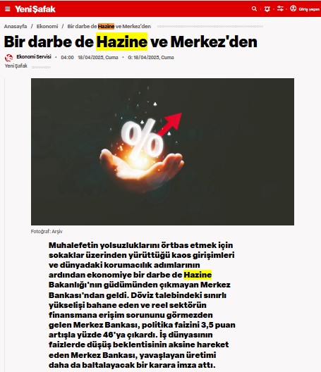 İmamoğlu’nun tutuklanması kararının iktisada daha fazla yük getireceği kaygısı Hazin ve Maliye Bakanı Mehmet Şimşek yönetimindeki enflasyonla gayret programını da zora soktu. Merkez Bankası siyaset faizini 350 baz puan artırdı ve yüzde 46’ya yükseltti. Piyasa beklentileri siyaset faizinin yüzde 42,5 düzeyinde sabit tutulacağı istikametindeydi. Karar “ekonomide İmamoğlu etkisi” olarak okundu. Merkez Bankası’nın kararı, manipülatif haberleri ile sık sık faiz indirimi daveti yapan Yeni Şafak gazetesini kızdırdı. Yeni Şafak Bakan Şimşek’i açıktan hedef aldı.