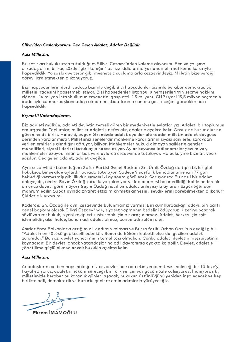 18 Mart tarihinde 31 sene evvel almaya hak kazandığı diploması elinden alınan, 19 Mart sabahı şafak operasyonu ile gözaltına alınan ve 23 Mart tarihinde çıkarıldığı mahkeme tarafından tutuklanan Cumhurbaşkanı adayı Ekrem İmamoğlu, tutuklu bulunduğu Silivri Cezaevi’nden bir mektup paylaştı.