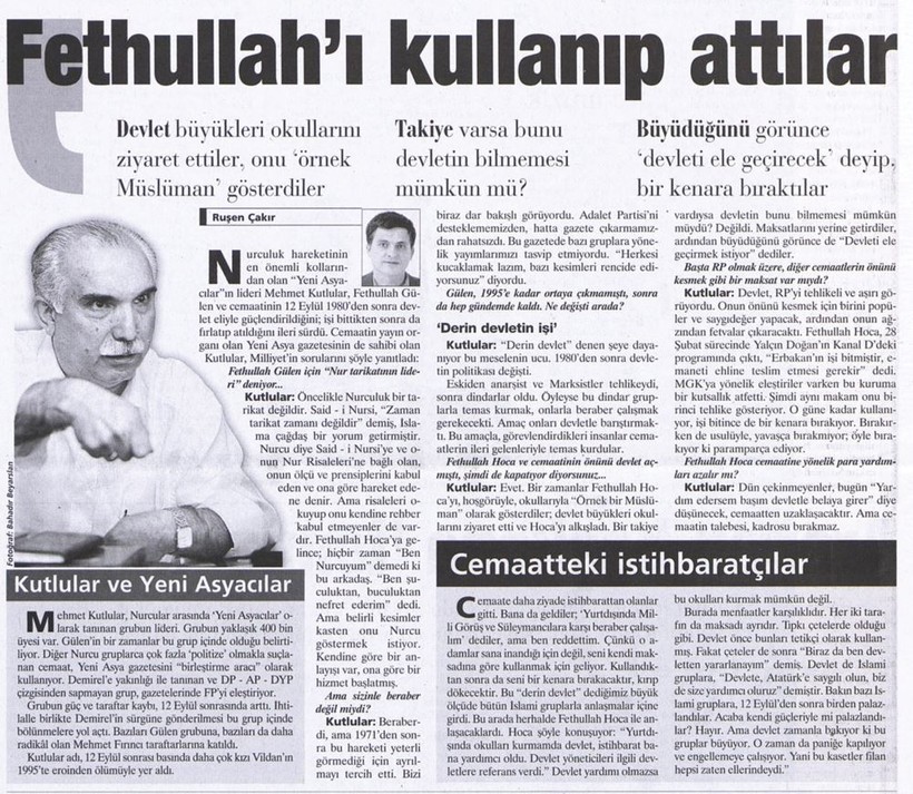 Ruşen Çakır’ın 26 Haziran 1999 yılında Milliyet gazetesinde, “Fethullah’ı kullanıp attılar” başlığıyla yayınlanan yazısını da içeren yazı dizisi, Yeni Asya gazetesi tarafından “Dizi: Vefat yıl dönümü vesilesiyle Mehmet Kutlular’dan hizmet hatıraları” başlığıyla yine yayınlandı. Dizinin 6’ncı yazısı, “Fethullah Gülen’le yolumuz nasıl ayrıldı?” başlığıyla yer aldı. “Biz, Fethullah Gülen’in eza çıkaracağını sezdiğimiz için -1973 olabilir- Hocayı İstanbul’a çağırdık. Bu sezgimiz kanıtlara dayanıyordu. – Gülen’in etrafında birtakım beşerler toplanmış, ona birtakım makamlar izafe ediyorlardı. Kimisi “Hz. İsa,” kimisi ‘Mehdî,’ kimisi de ‘Kahtanî’ diyordu” biçiminde yaptıkları görüşmenin anlatıldığı yazı şu formda: