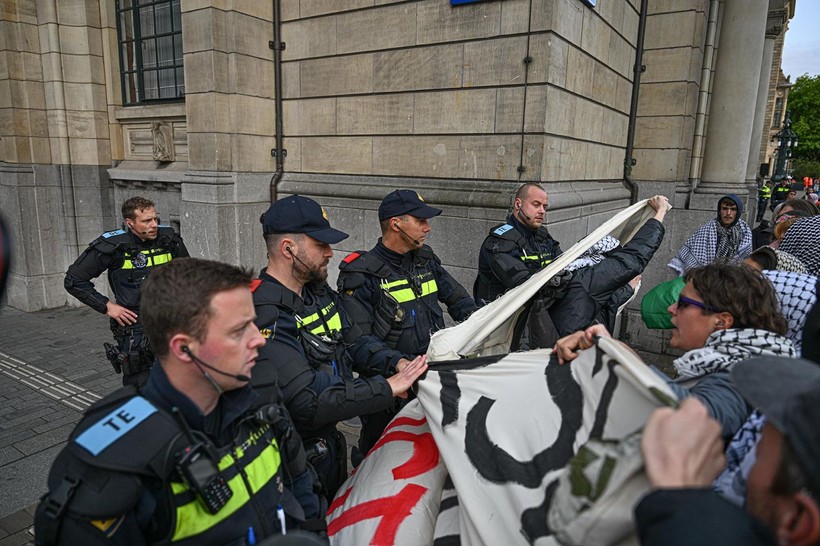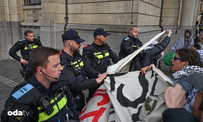 Hollanda’nın Rotterdam kentinde, belediye binası önünde toplanan bir küme gösterici, Danimarkalı deniz nakliyatı şirketi Maersk ve Rotterdam Limanı üzerinden İsrail’e F-35 savaş uçağı kesimleri gönderilmesini protesto etti.