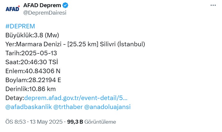 Silivri açıklarında saat 16:17’de 3.4 büyüklüğünde zelzele meydana geldi. Sarsıntının 23 Nisan’daki 6.2 büyüklüğündeki sarsıntının olduğu bölgede olması dikkat çekerken zelzelenin derinliği 13,1 kilometre olarak kaydedildi.