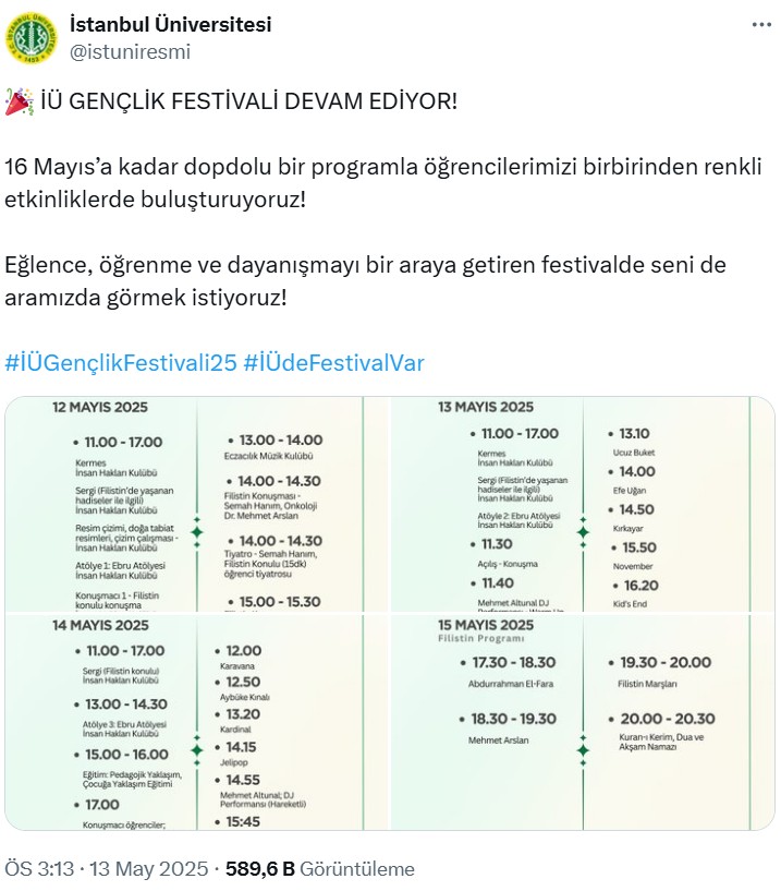 İstanbul Üniversitesi’nde eleştirilen Gençlik Şenliği: ‘Nereden nereye’… Pedagoji, Filistin… Bahar Şenliği neden, ne vakittir yok.. En son kim sahne aldı