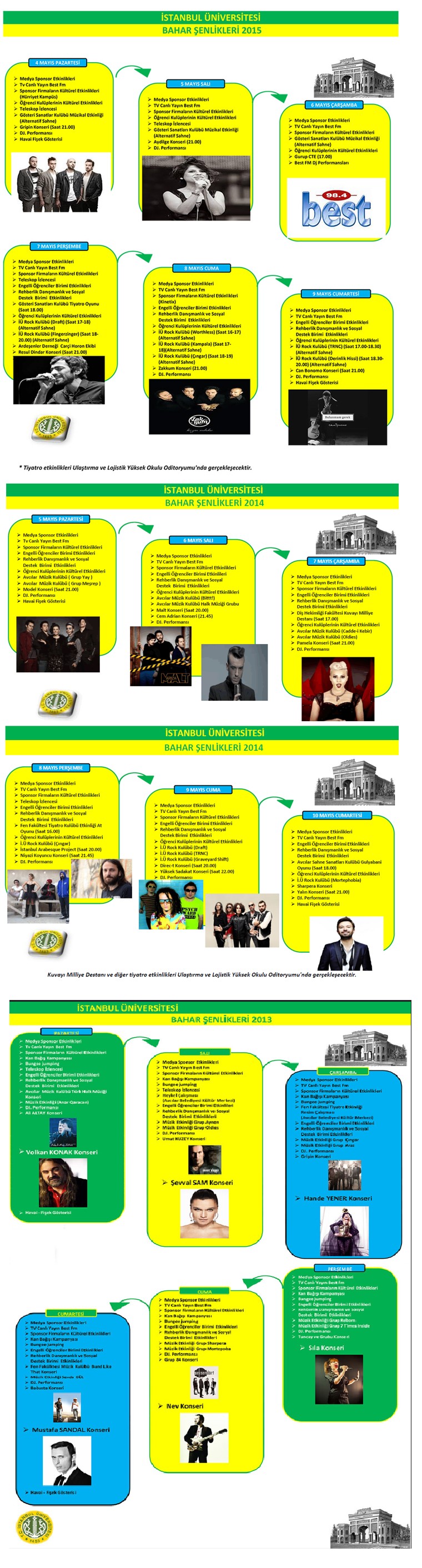 İstanbul Üniversitesi’nin 2015 yılında gerçekleşen son Bahar Şenliği etkinliğinde Gripin, Aydilge, Resul Dindar, Zakkum, Can Bonomo üzere isimler sahne almıştı. Radyoların DJ’lerinden performanslar ve öğrenci kulüpleri aktiflikleri de yapılmıştı.