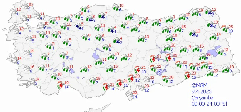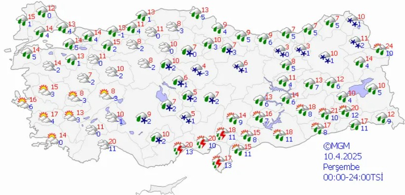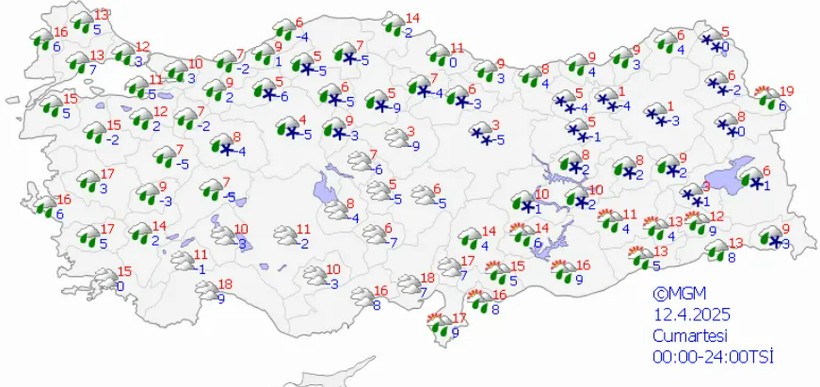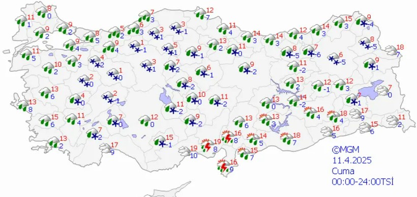 Meteoroloji’nin haritalı raporunda, İç Anadolu, Doğu Anadolu, Güneydoğu Anadolu ve Karadeniz’in iç kesitleri başta olmak üzere yurdun kuzey ve doğu bölgelerinde kar yağışı öngörülüyor. Akdeniz, Ege ve Güney Doğu vilayetlerinde ise sağanak yağış ve gök gürültülü fırtına riski bulunuyor. Bilhassa Muğla, Antalya, Şırnak, Hakkari ve Van etraflarında kuvvetli yağışlar nedeniyle sel ve su baskını uyarısı yapıldı.