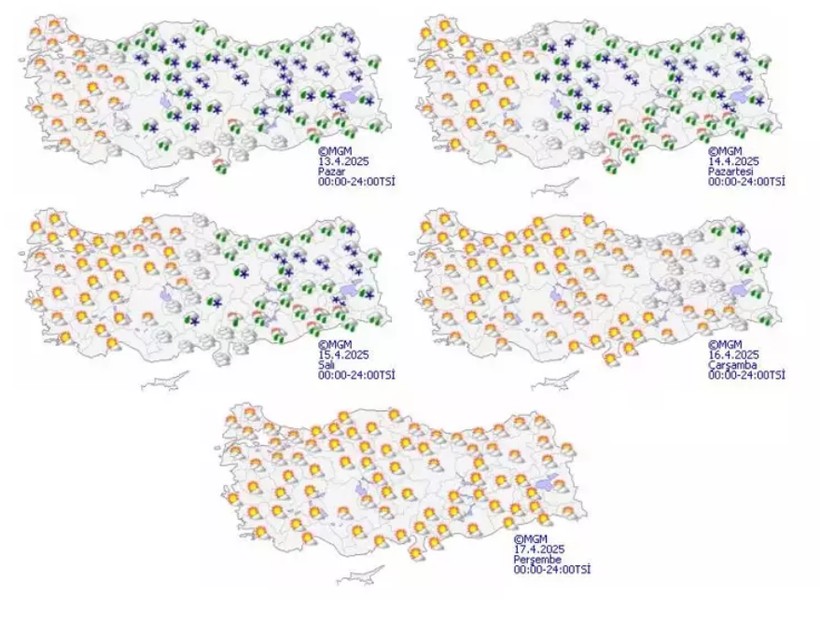 Beş günlük hava durum kestirim haritasına nazaran Çarşamba gününe kadar iç Anadolu ve Doğu Anadolu’da yağışlar tesirini gösterecek. Perşembe günü ise tüm yurtta güneşli hava hakim olacak.
