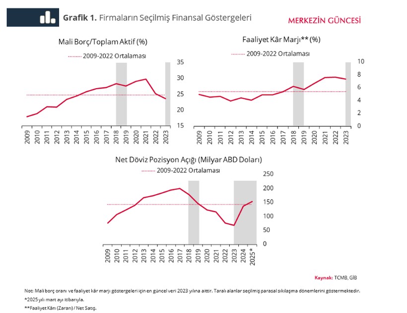 Firmalar son nakdî sıkılaşma döngüsüne, izafî olarak düşük borçluluk ve yüksek kârlılık oranları ile girdi (Grafik 1). 2009 yılından itibaren artış eğilimi sergileyen ve 2021 yılında tarihi doruğuna ulaştıktan sonra süratle gerileyen mali borçların toplam etkinlere oranı, 2023 yılında tarihi ortalamaların altındaydı. Ayrıyeten, faaliyet kâr marjı tarihi yüksek düzeyini korurken net döviz durum açığı da epeyce gerilemişti. Bu durum gerçek kesimin ilgili periyoda güçlü finansal tamponla girdiğine işaret ediyor. Bununla birlikte, son devirde net döviz konum açığında yaşanan artışı ve öncü göstergelerin[1] işaret ettiği üzere firmaların kârlılığındaki düşüşü not etmekte yarar var.