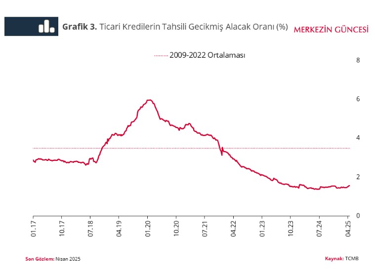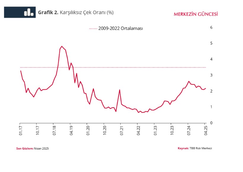 Reel bölümün son sıkılaşma devrine güçlü finansal tamponla girmesinin tesirleri, temel temerrüt göstergelerinde gözlenebiliyor. Gerçekten karşılıksız çek oranı mali sıkılaşmanın birinci aylarında artmakla birlikte tarihi ortalamasının epeyce altında kalmayı sürdürdü ve 2024 ağustos ayından sonra da bir ölçü düştü (Grafik 2).