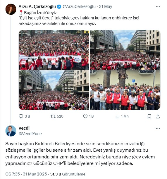 “Sayın lider Kırklareli Belediyesinde sizin sendikanızın imzaladığı kontrat ile personeller bu sene sıfır artırım aldı. Evet yanlış duymadınız bu enflasyon ortamında sıfır artırım aldı. Neredesiniz burada niçin grev aksiyon yapmadınız? Gücünüz CHP’li belediyelere mi yetiyor yalnızca.”