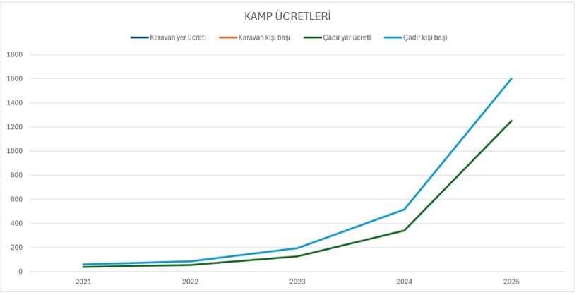 Bu yaz temmuz ayında kamp yapmak isteyen bir karavan sahibi 2021 yılında 60 TL olan karavan yer fiyatı ve karavanda kalan kişi başı fiyat için 1600 TL ödemek durumunda olurken, çadırda kalan kişi de gecelik tıpkı fiyatı ödüyor. Çadır yer fiyatı ise 2021 yılında 40 TL iken, 2025’te 1250 TL oluyor. Fiyatlar 5 yılda ortalama yüzde 2681 oranında artıyor.