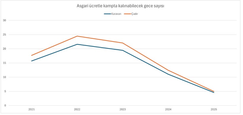 Karavan ile iki kişi temmuz ayında 2021 yılında 16 gün, 2022 yılında 22 gün, 2023 yılında 19 gün, 2024 yılında 11 gün tatil yapabilirken, 2025 yılında 5 gün tatil yapabiliyor.