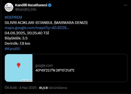 Kandilli Rasathanesi İstanbul Silivri açıklarında 3.5 büyüklüğünde bir sarsıntı olduğunu açıkladı.