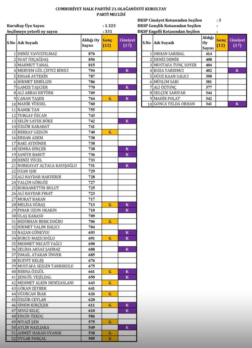 BKSP listesine seçilenler aynı zamanda Parti Meclisi’nin de üyesi olduğu için buradaki 8 isim de PM’ye girmeyi başardı.