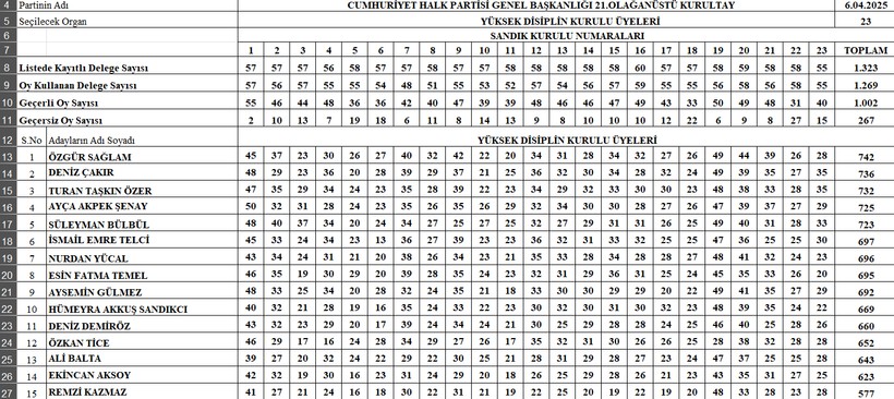 Resmi olmayan sonuçlara nazaran, Özgür Sağlam 742 ile YDK’de en çok oy alan isim oldu. Sağlam’ı, 736 oy ile Deniz Çakır ve 732 oy ile Turan Taşkın Özer izledi.