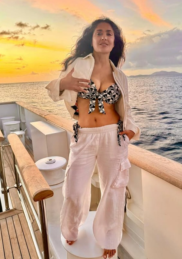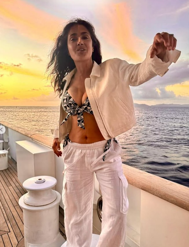 Fransız iş insanı François-Henri Pinault ile evli olan oyuncu Salma Hayek, 58 yaşında olmasına karşın fit görünümüyle dikkat çekiyor.