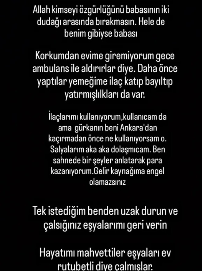 İlaçlarımı kullanıyorum, kullanıcam da fakat Gürkan beni Ankara’dan kaçırmadan evvel ne kullanıyorsam o. Salyalarım aka aka dolaşmıcam. Ben sahnede bir şeyler anlatarak para kazanıyorum. Gelir kaynağıma mahzur olamazsınız. Tek istediğim benden uzak durun ve çaldığınız eşyalarımı geri verin. Hayatımı mahvettiler eşyaları mesken rutubetli diye çalmışlar”