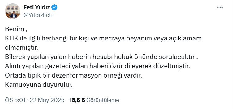 Konuyla ilgili Feti Yıldız, X hesabından bir yalanlama yaptı.
