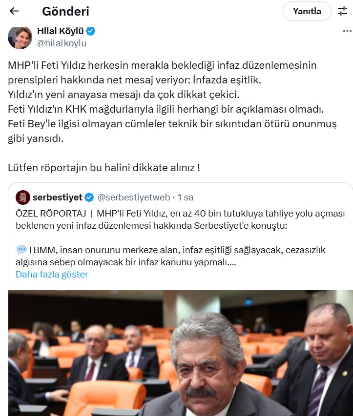 “MHP’li Feti Yıldız herkesin merakla beklediği infaz düzenlemesinin prensipleri hakkında net bildiri veriyor: İnfazda eşitlik. Yıldız’ın yeni anayasa iletisi da çok dikkat cazibeli. Feti Yıldız’ın KHK mağdurlarıyla ilgili rastgele bir açıklaması olmadı. Feti Bey’le ilgisi olmayan cümleler teknik bir zahmetten dolayı onunmuş üzere yansıdı. Lütfen röportajın bu halini dikkate alınız!”