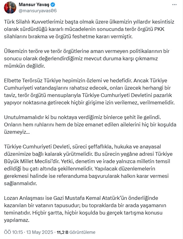 Terör örgütü PKK’nın 5-7 Mayıs tarihlerinde toplanan fesih kongresinin kararları açıklandı. Karar bildirgesinde, “PKK ismiyle yürütülen çalışmalar sonlandırıldı.” denildi. “PKK; kaynağını Lozan Antlaşması ve 1924 Anayasasından alan Kürt inkâr ve imha siyasetine karşı, halkımızın özgürlük hareketi olarak tarih sahnesine çıktı” tabirleri tartışma yaratırken, Mansur Yavaş’tan şu açıklama geldi: