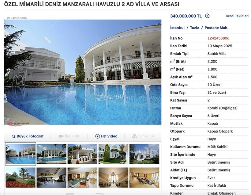 “Özel Mimarili, Deniz Görünümlü, Havuzlu 2 Adet Villa ve Arsası” başlığıyla satışa sunulan Tuzla villası, geniş ömür alanları ve estetik dizaynıyla dikkat çekiyor. 340 milyon TL’lik fiyat etiketiyle İstanbul’un en değerli emlakları ortasında yer alan bu lüks malikane, özel bahçesi ve panoramik deniz görünümüyle öne çıkıyor.