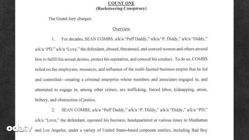 Combs, haraççılık komplosu, zorla seks ticareti, fuhuş için taşıma, adam kaçırma, kundaklama, rüşvet ve şahit karartma üzere ağır RICO suçlamalarıyla federal mahkemede yargılanıyor. Şayet hatalı bulunursa, ömür uzunluğu mahpus cezası alabilir.
