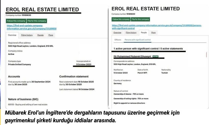 Bir öbür argüman ise; Mübarek Erol’un dergahları üzerine geçirmek gayesiyle İngiltere’de göstermelik bir gayrimenkul şirketi açtığı formunda. Firmaların türel ve mali sorumluluklarını kaydedip denetleyen “Companies House”un resmi sitesinde yer alan bilgiye nazaran; Erol bu şirketi babasının vefatından yaklaşık üç ay sonra, 5 Ekim 2023’te kurdu. Bahsi geçen iki dergahın bölüm süreçleri de bu şirket üzerinden yapıldı.