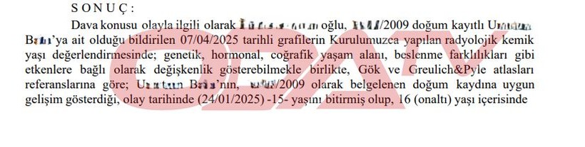 “U.B’nin 2009 olarak belgelenen doğum kaydına uygun gelişim gösterdiği, olay tarihinde (24/01/2025) -15- yaşını bitirmiş olup, 16 (on altı) yaşı olduğu ve -16- yaşını bitirmediğinin kabulünün uygun olacağı oy birliği ile mütalaa olunur”