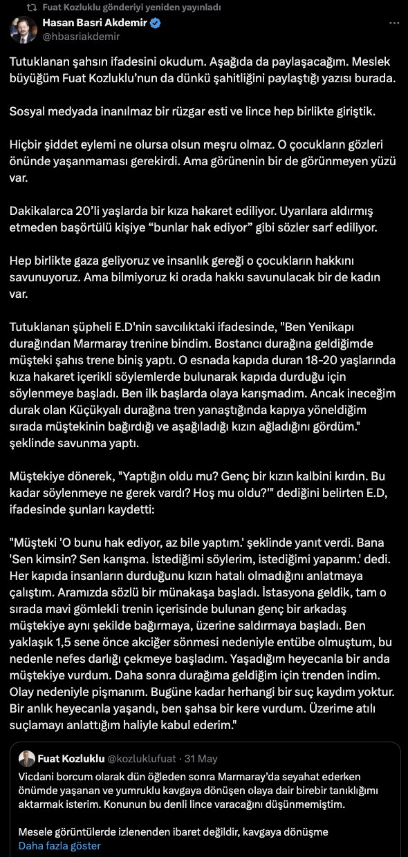 Gazeteci Fuat Kozluklu, 30 Mayıs 2025 günü Marmaray’da gerçekleşen bir olayın imajlarını, Emniyet’i de etiketleyerek paylaştı: