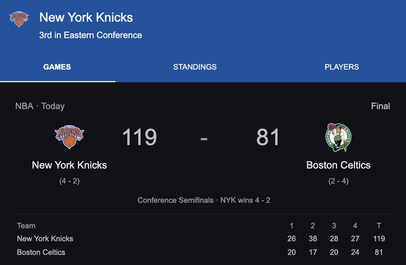 Knicks, 1994, 1999 ve 2000’deki Doğu finallerinde üç maçta karşılaştıkları Indiana Pacers ile 21 Mayıs Çarşamba günü oynayacak.