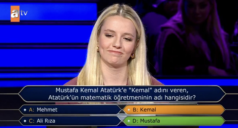 Yarışmacıya, “Mustafa Kemal Atatürk’e ‘Kemal’ ismini veren matematik öğretmeninin ismi hangisidir?” halinde soru yöneltildi. Şıklar ortasında “Mehmet”, “Kemal”, “Ali Rıza” ve “Mustafa” isimleri yer aldı.