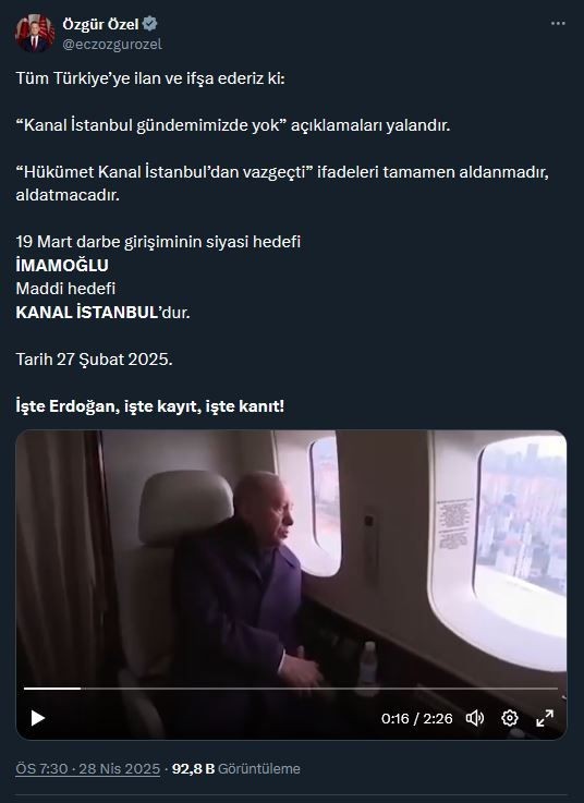 Özgür Özel, Ulaştırma Bakanı Abdülkadir Uraloğlu’nun Youtube hesabından 27 Şubat 2025’te yayınlanan görüntüyü paylaştı.