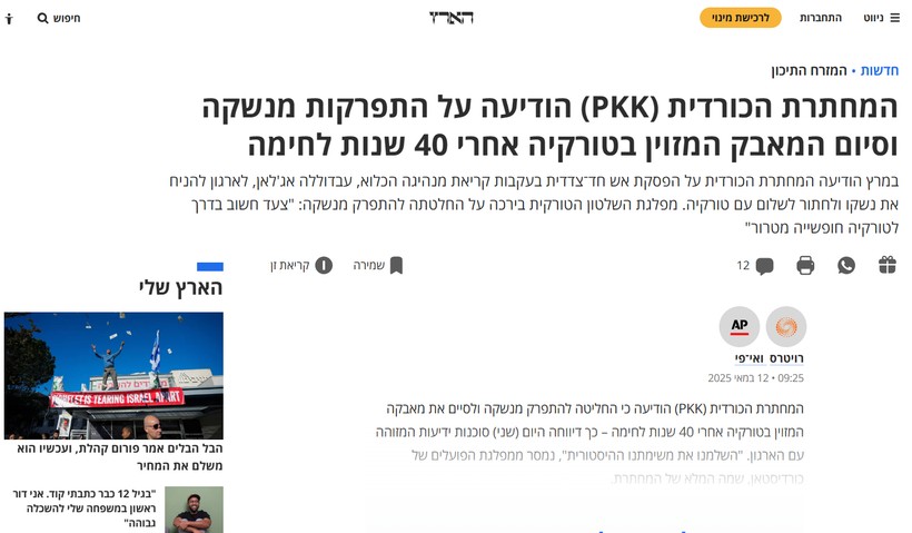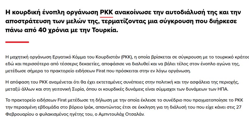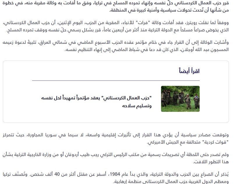 “Türkiye devletiyle 40 yıldır kanlı bir isyan yürüten Kürt kökenli bir küme, bugün yaptığı açıklamada silah bırakacağını ve çatışmayı sona erdireceğini duyurdu. Bu kararın komşu ülkelerde de yankı bulması bekleniyor… PKK, başlangıçta Türkiye’deki Kürt azınlık için bağımsız bir devlet kurma hedefi güden ayrılıkçı bir hareket olarak ortaya çıktı. Lakin son yıllarda Türkiye içinde Kürtlere daha fazla hak talep ettiğini söz ediyordu…