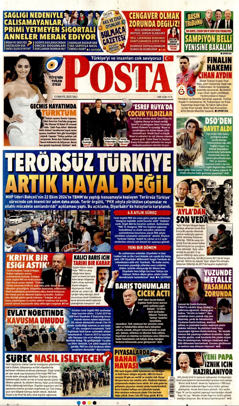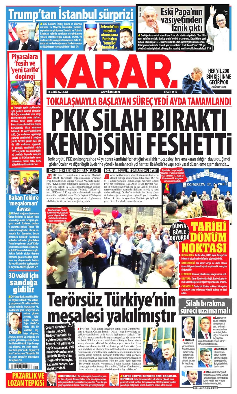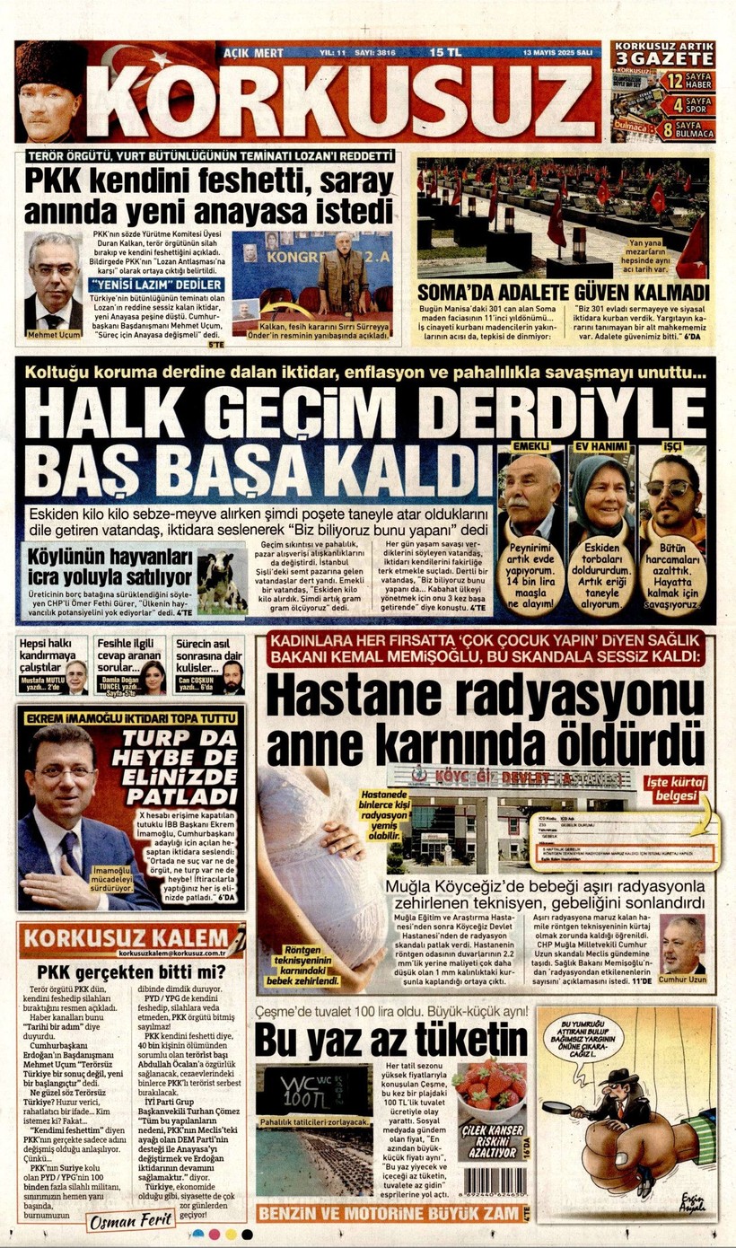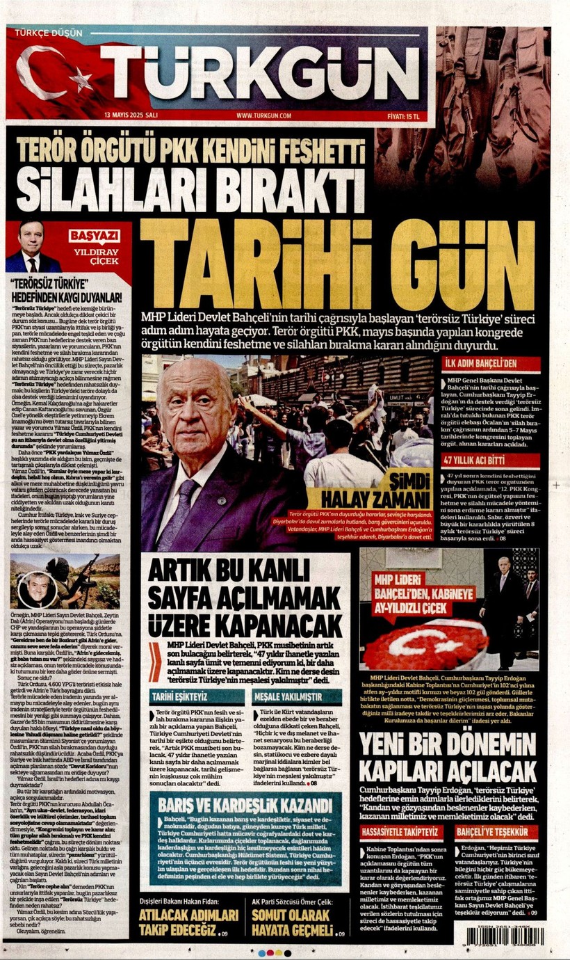 Cumhuriyet gazetesi “Lozan’a ve 1924 Anayasası’na savaş açtılar” derken, Sözcü gazetesi ise “Kandil’i boşaltıyoruz Suriye’ye karışmayın” yorumunu yaptı. Korkusuz gazetesi ise “İktidar yeni yasa” istiyor başlığı attı. Birgün gazetesi ise “İktidar niyetini erken açık etti” diyerek terör örgütü PKK’nın fesih kararına karşı yaklaşımını eleştirdi. Kozmik gazetesi de “Kürtlerin hak arama gayretinin boğmak için gereken terör şiddet fiili ortadan kalktı” dedi. İşte 13 Mayıs 2025 gazete manşetleri…