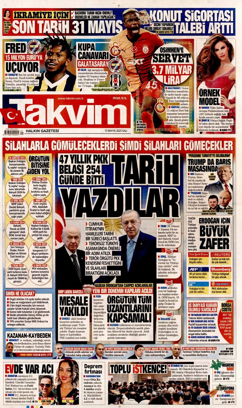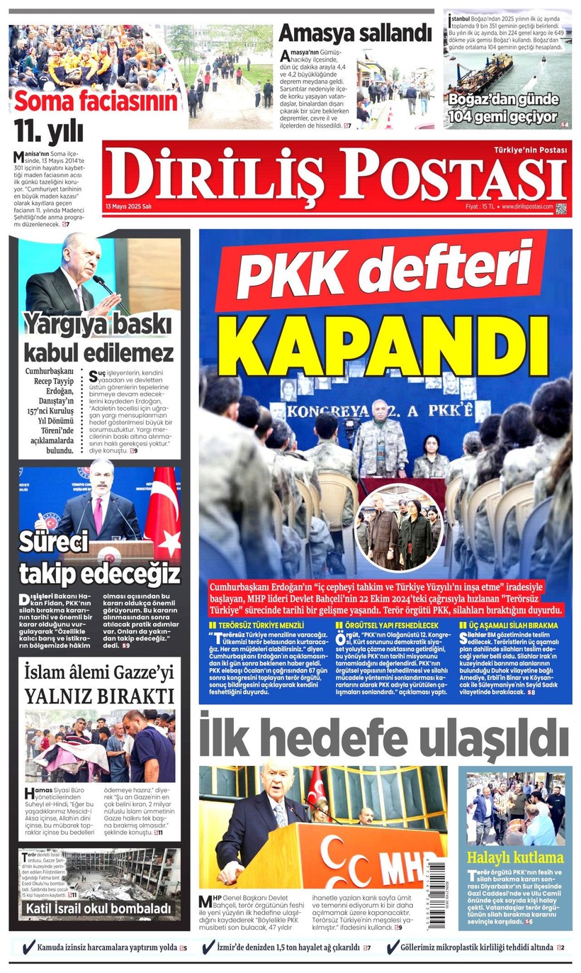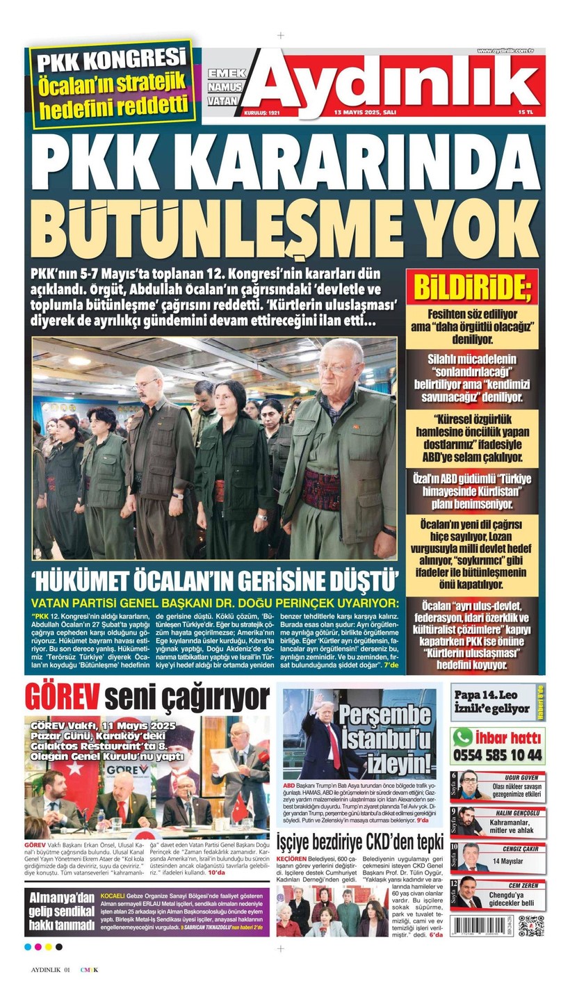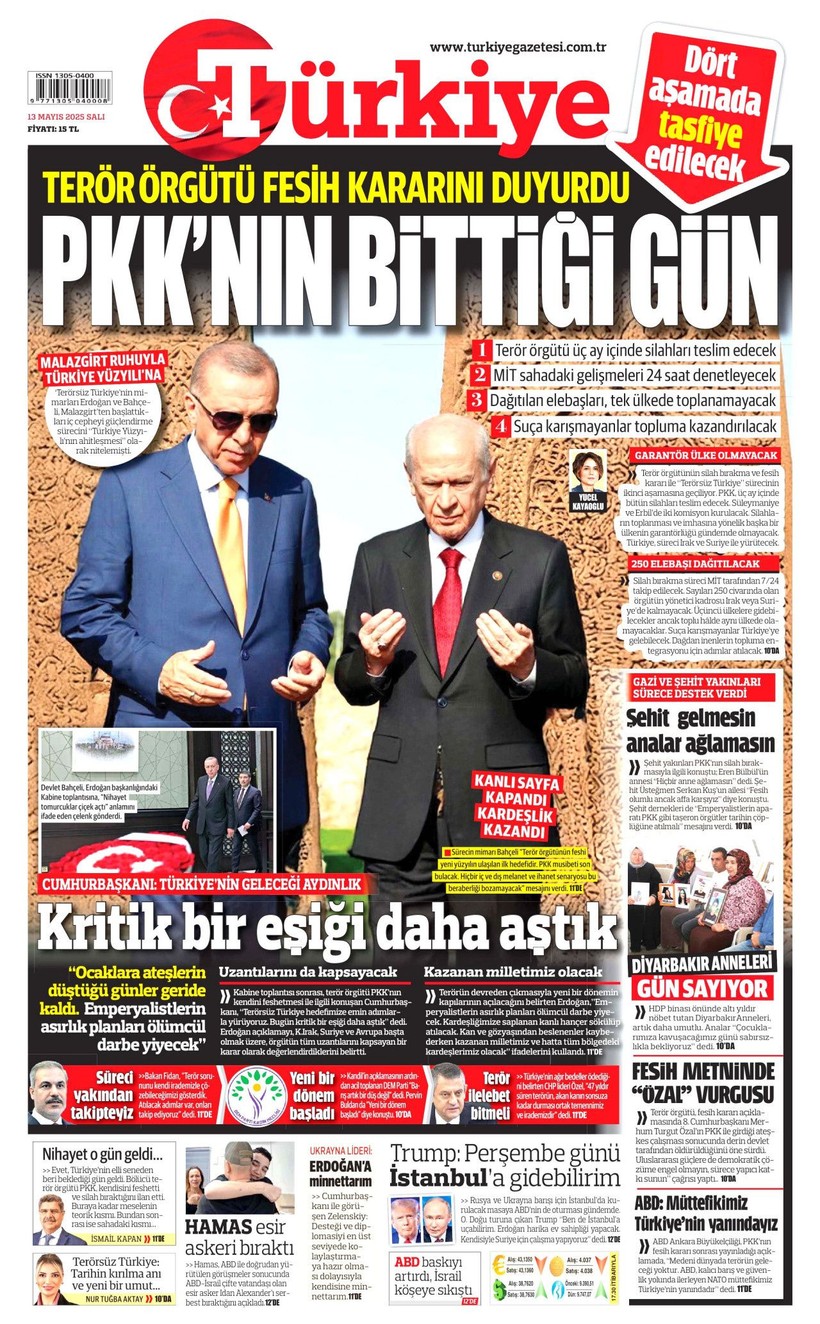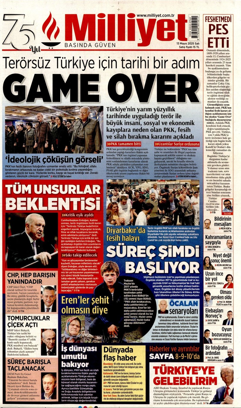 Cumhuriyet gazetesi “Lozan’a ve 1924 Anayasası’na savaş açtılar” derken, Sözcü gazetesi ise “Kandil’i boşaltıyoruz Suriye’ye karışmayın” yorumunu yaptı. Korkusuz gazetesi ise “İktidar yeni yasa” istiyor başlığı attı. Birgün gazetesi ise “İktidar niyetini erken açık etti” diyerek terör örgütü PKK’nın fesih kararına karşı yaklaşımını eleştirdi. Kozmik gazetesi de “Kürtlerin hak arama gayretinin boğmak için gereken terör şiddet fiili ortadan kalktı” dedi. İşte 13 Mayıs 2025 gazete manşetleri…