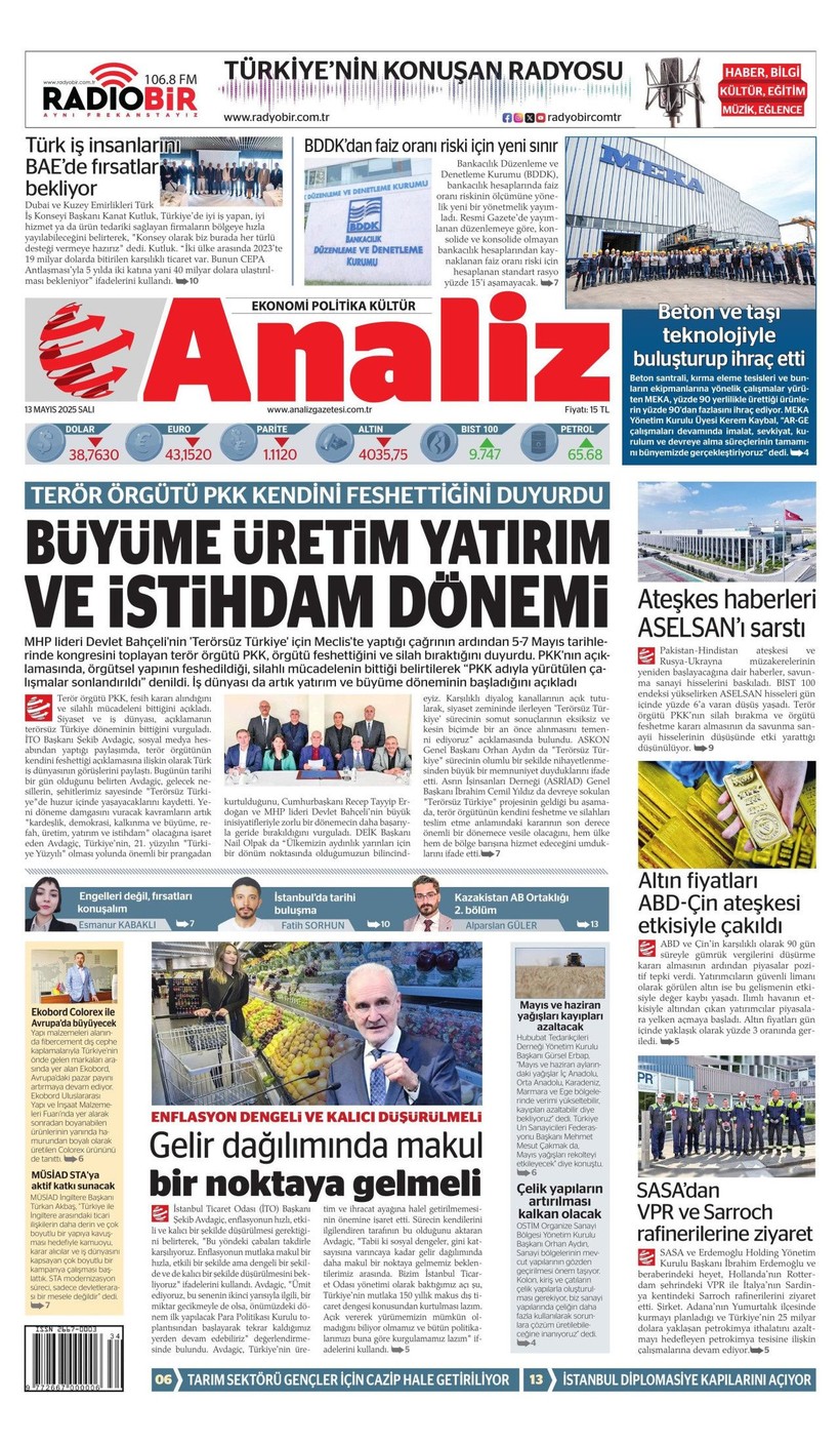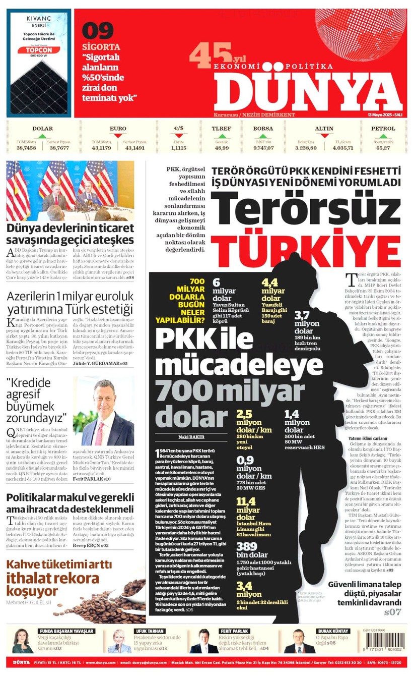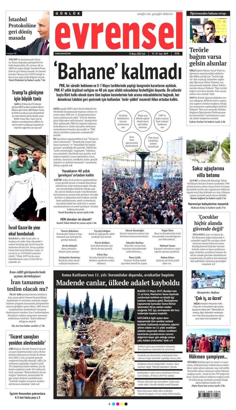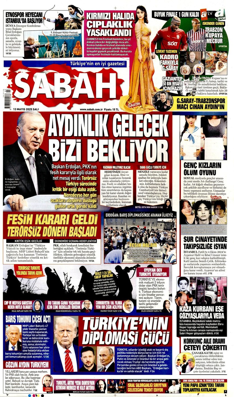 Cumhuriyet gazetesi “Lozan’a ve 1924 Anayasası’na savaş açtılar” derken, Sözcü gazetesi ise “Kandil’i boşaltıyoruz Suriye’ye karışmayın” yorumunu yaptı. Korkusuz gazetesi ise “İktidar yeni yasa” istiyor başlığı attı. Birgün gazetesi ise “İktidar niyetini erken açık etti” diyerek terör örgütü PKK’nın fesih kararına karşı yaklaşımını eleştirdi. Kozmik gazetesi de “Kürtlerin hak arama gayretinin boğmak için gereken terör şiddet fiili ortadan kalktı” dedi. İşte 13 Mayıs 2025 gazete manşetleri…