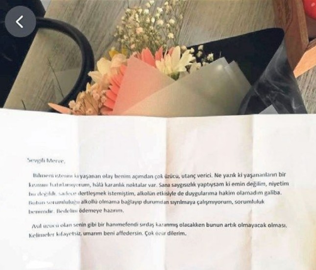 “Bana alaka teklifinde bulundu. ‘Birlikte çalıştığımız doktorumsunuz. Eşiniz ve çocuğunuz var’ diyerek reddettim. Bunun üzerine özür mahiyetinde üzerinde not bulunan bir çiçek gönderdi. Bu çiçeğin fotoğrafı da var. Notta her şeyin sorumlusu olduğunu ve pişman olduğunu belirtiyordu. Ben de özrünü kabul ettim. ‘Bundan sonra doktor tekniker çizgimizi aşmayalım, muhabbet dahi etmeyelim, yalnızca işimizi yapalım’ dedim. Bir mühlet bu türlü devam etti”