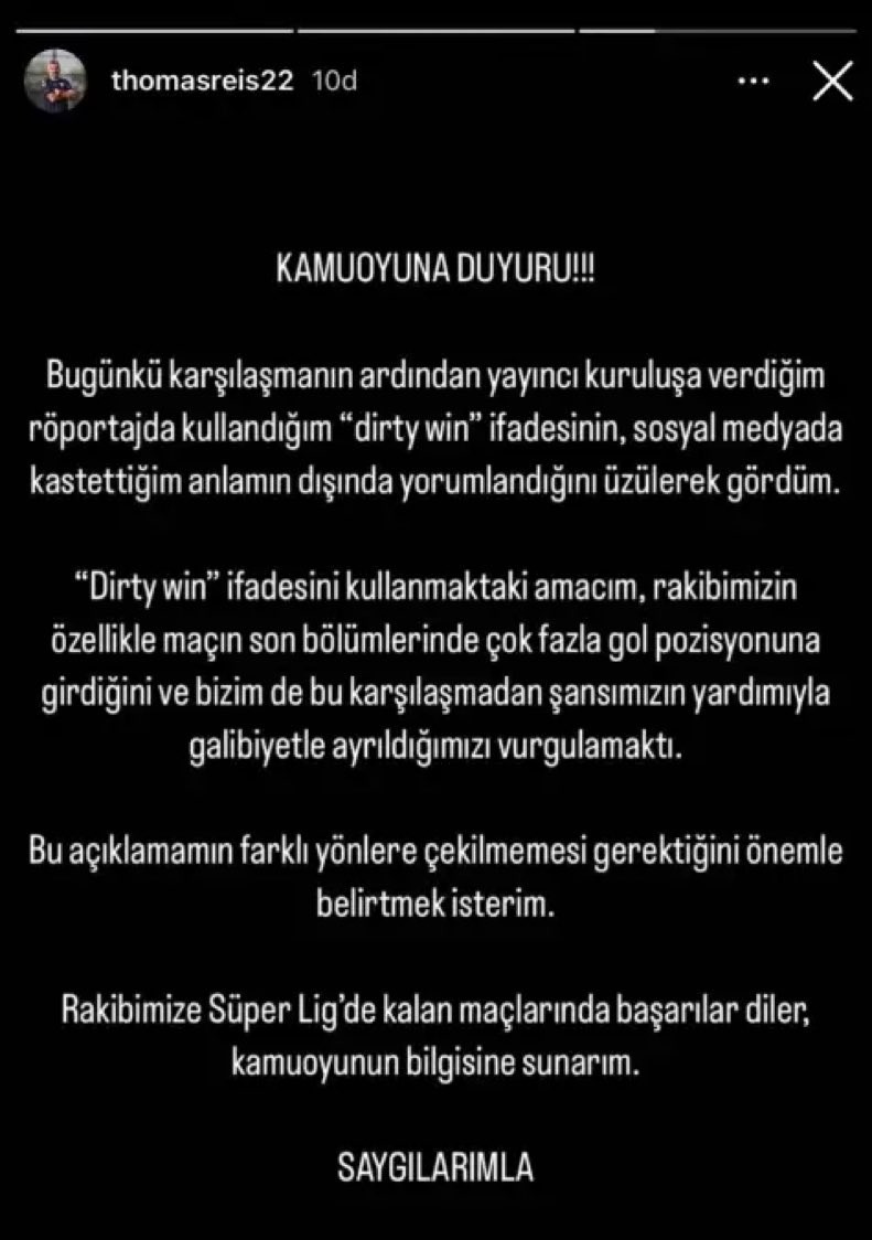 Yaptığı açıklamanın lisan farkı nedeniyle yanlış anlaşıldığını belirten Reis toplumsal medya hesabından yaptığı açıklamada, “Karşılaşmanın akabinde yayıncı kuruluşa verdiğim röportajda kullandığım “dirty win” sözünün, toplumsal medyada kastettiğim mananın dışında yorumlandığını üzülerek gördüm. ‘Dirty win’ tabirini kullanmaktaki maksadım, rakibimizin bilhassa maçın son kısımlarında çok fazla gol konumuna girdiğini ve bizim de bu müsabakadan bahtımızın yardımıyla galibiyetle ayrıldığımızı vurgulamaktı. Bu açıklamamın farklı istikametlere çekilmemesi gerektiğini değerle belirtmek isterim. Rakibimize Süper Lig’de kalan maçlarında muvaffakiyetler diler, kamuoyunun bilgisine sunarım” sözlerini kullandı.