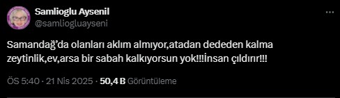 Şamlıoğlu, “Samandağ’da olanları aklım almıyor, atadan dededen kalma zeytinlik, konut, arsa bir sabah kalkıyorsun yok! İnsan çıldırır” paylaşımında bulundu.